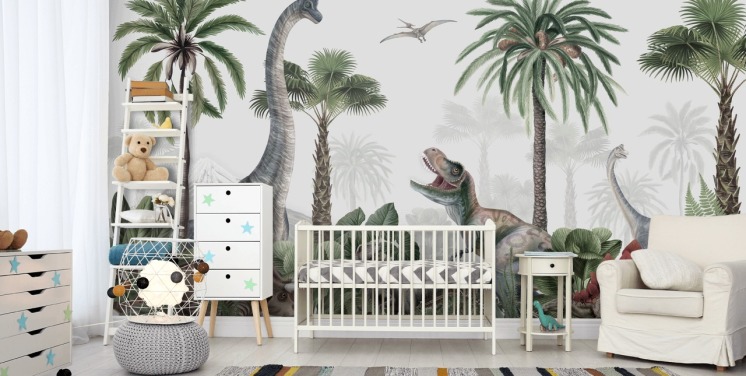 papel de parede de selva personalizado verde e branco chamado Jungle Jive de Kikki Belle para quarto de criança e berçário