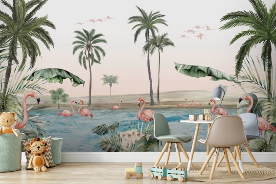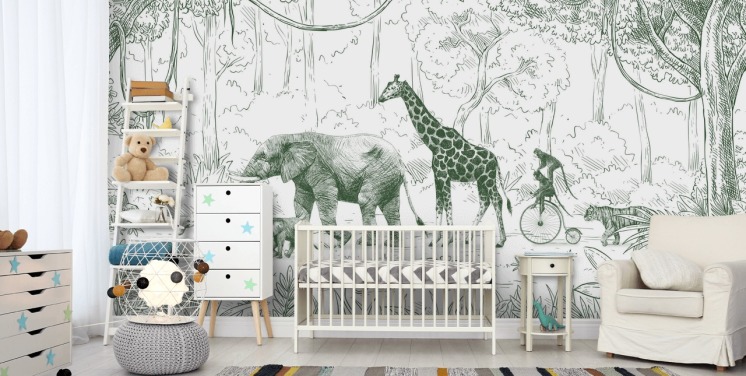 mural de papel de parede verde para crianças chamado Green Joyful Jungle de Kikki Belle para quartos infantis