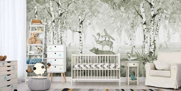 mural de papel de parede florestal infantil branco chamado Vintage White Fantastic Forest de Kikki Belle para quartos infantis