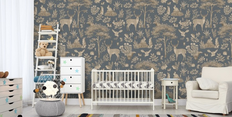 mural de papel de parede azul para crianças chamado Vintage Blue Fantastic Forest de Kikki Belle para um berçário ou quarto infantil
