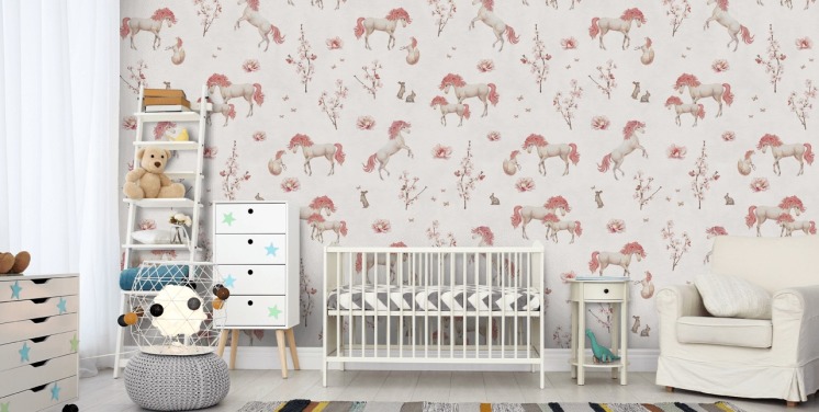 mural de papel de parede de unicórnio branco chamado White Unique Unicorn de Kikki Belle para quartos infantis e creches