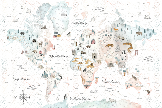 Laura Marshall é uma talentosa artista e fotógrafa. Entre suas raízes rurais em Michigan e sua infância passada acampando nos Estados Unidos, Laura desenvolveu um amor profundamente enraizado pela natureza e pelo planeta. Embora seja principalmente uma fotógrafa, ela também adora aquarelas e guache, o que ela mostra tão claramente em seus belos desenhos de papel de parede de mapas do mundo.