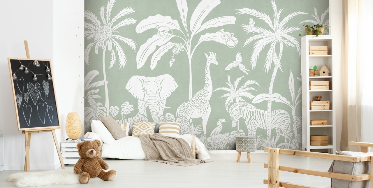 O sonho de um amante da vida selvagem é nosso mural Monocromático Selva em Verde. Este mural de papel de parede de selva feito à medida é o complemento perfeito para qualquer espaço doméstico, ainda mais ideal para uma sala de jogos para crianças.