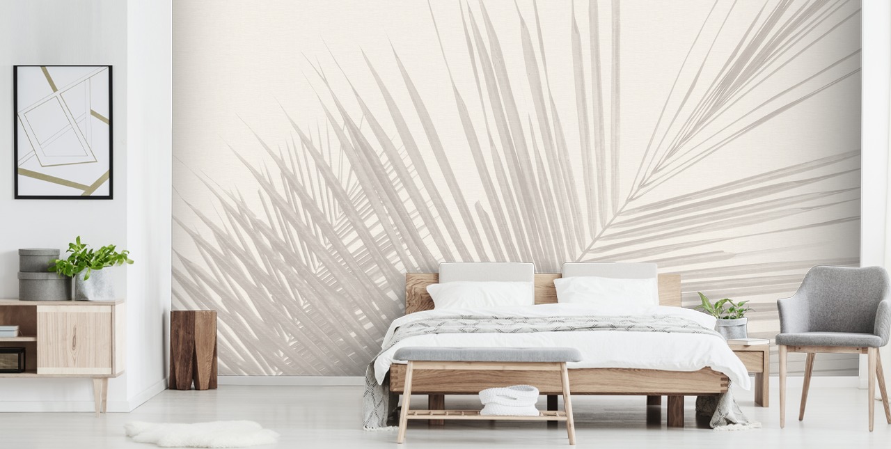Folhas de palmeira tropicais monocromáticas são um design moderno e elegante que infunde qualquer espaço com a vibração e a vitalidade da selva. É um mural de folha de palmeira simples, mas sofisticado, que pode transformar seu quarto em um santuário pessoal do estresse da vida cotidiana.
