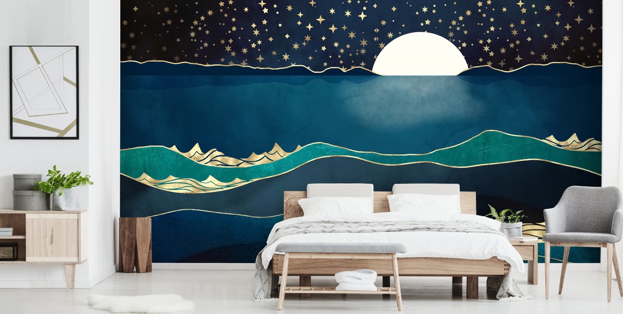 Mergulhe sua casa em um impressionante mural de parede Moonlit Stars da SpaceFrog Designs. Todos os murais de parede são feitos para se adequar às suas dimensões!