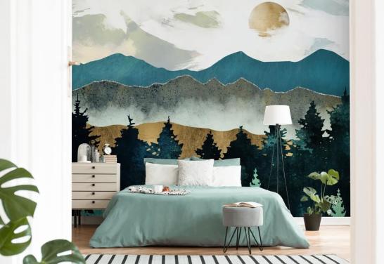 mural abstrato de papel de parede de montanha azul marinho e dourado chamado Star Lake da SpaceFrog Designs para quartos