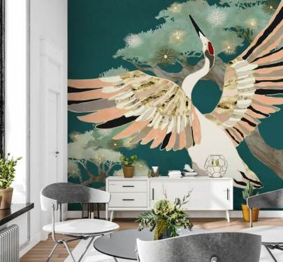 fundo verde com árvores orientais e guindaste branco com asas cor de rosa e dourado papel de parede