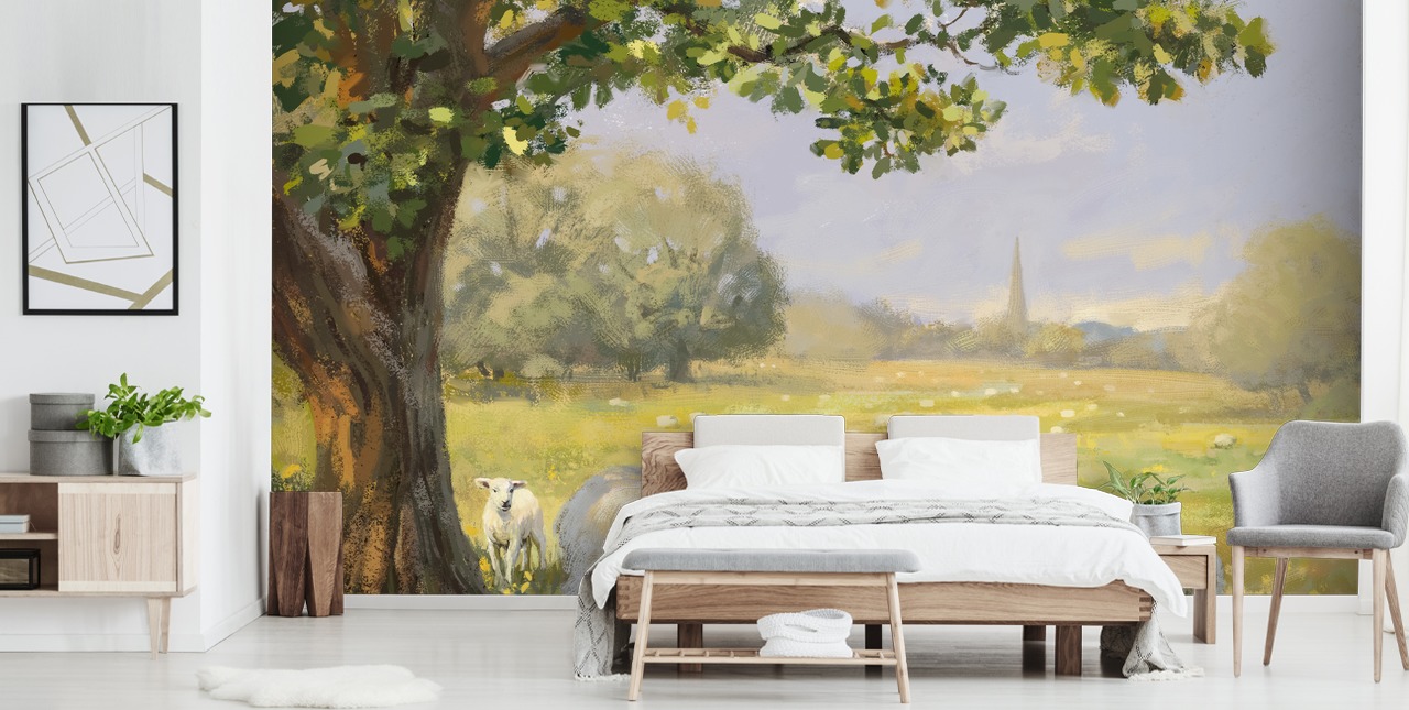 Crie uma bela parede de destaque com o lindo mural de papel de parede Spring Lambs do artista Daniel Rodgers.