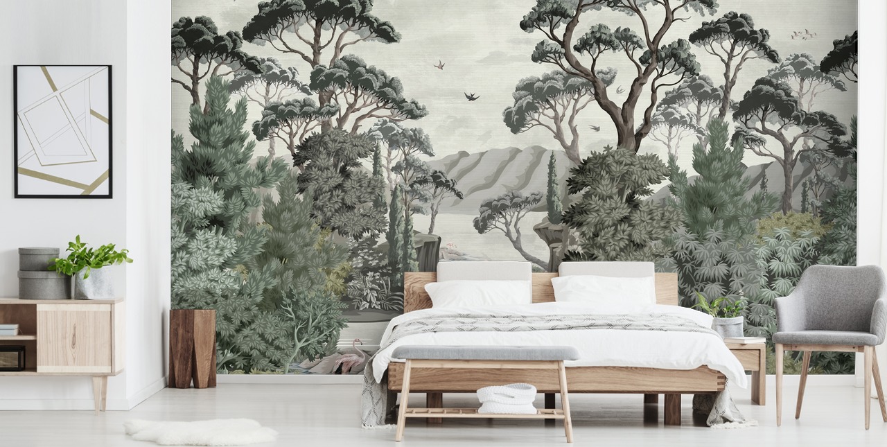 O papel de parede Passage tem aquele toque de uma bela obra de arte de um mestre, a floresta decídua e o rio que corre centralmente proporcionam uma sensação de casa imponente. As cores dominantes aqui são verdes e cinzas, com uma mancha colorida de cegonhas alinhando a passagem do rio. The Passage é um mural de papel de parede muito calmo e tranquilo com um comportamento elegante que funcionará bem em vários tipos de quartos diferentes, desde banheiros e quartos até salas de leitura e bibliotecas para quem tiver a sorte de ter um em casa. Os tons pastel apresentados neste papel de parede épico certamente serão a estrela do show em seu novo quarto, não importa onde esteja.