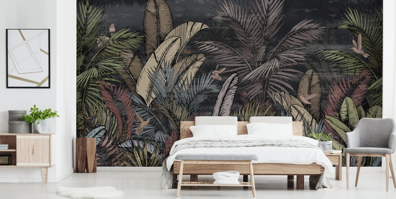 Papel de parede Tropical Evergreen at Night em preto e verde e feito sob medida para você.