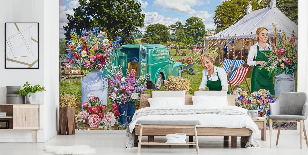 Traga uma parede idílica para a sua casa com este colorido papel de parede Wedding Flowers. Ótimo para trazer de volta memórias do dia do seu casamento ou para uma floricultura! Você pode sentir a apreensão e a emoção do dia especial que está por vir nesta bela pintura de Trevor Mitchell.