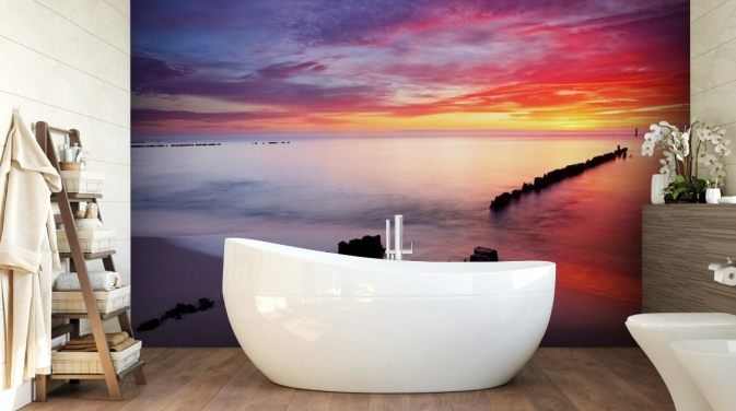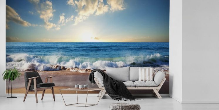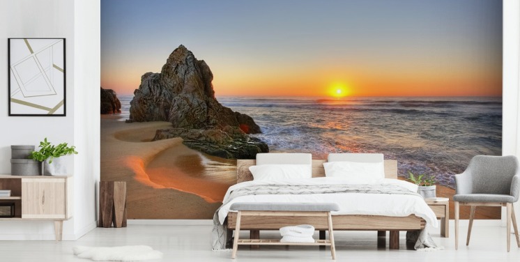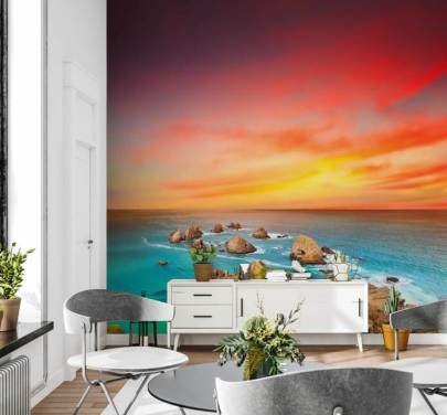 mural de papel de parede vermelho e laranja ao pôr do sol na praia chamado Sunset Over The Sea para quartos, escritórios e banheiros