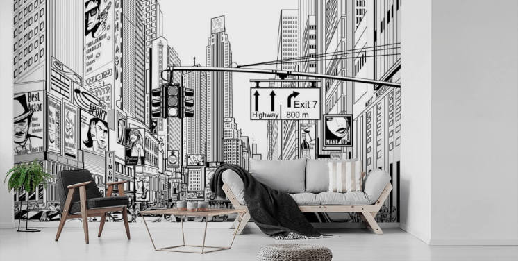 mural de papel de parede preto e branco da cidade de Nova York chamado Street in New York City para salas de estar, quartos e cozinhas