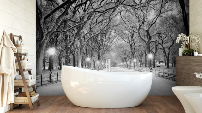 mural de papel de parede monocromático personalizado de Nova York chamado Central Park Covered in Snow para salas de estar ou salas de jantar