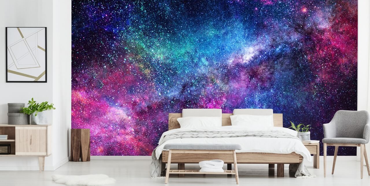 Impressione sua família e amigos com este deslumbrante mural de papel de parede Deep in Space na parede do seu escritório em casa, sala de estar ou quarto! Combine este incrível papel de parede galáxia com iluminação neon rosa e azul para uma sensação futurista e escolha uma mistura de acessórios de quarto preto e azul marinho para espelhar os tons neste design.