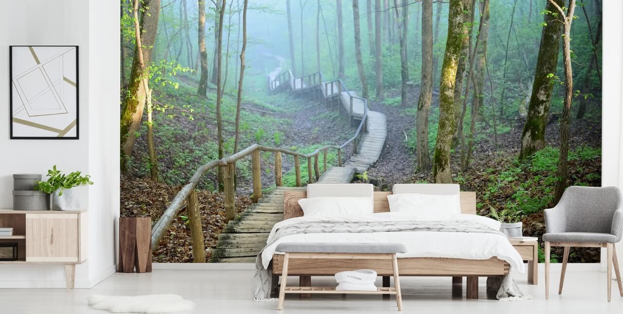 Adora estar ao ar livre? Escolha este mural de parede Foggy Forest Stairway feito à medida.