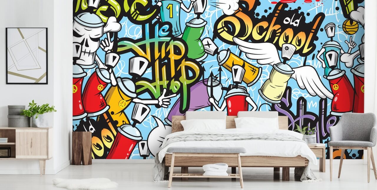 Se seu filho adora grafite, instale este papel de parede Graffiti Characters feito sob medida em seu quarto para surpreendê-lo.