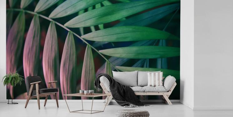 papel de parede de palmeira verde chamado Palm Trees and Butterflies Green at Wallsauce para quartos, salas de estar e cozinhas