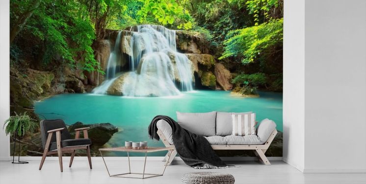 mural de papel de parede de cachoeira tropical chamado Waterfall em Kanchanaburi, Tailândia, para escritórios domésticos, spas e estúdios de ioga
