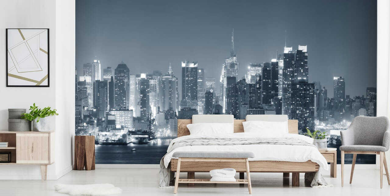 Impressionante mural panorâmico em preto e branco de Manhattan de Wallsauce. Este papel de parede de alta qualidade é feito sob medida para suas dimensões.