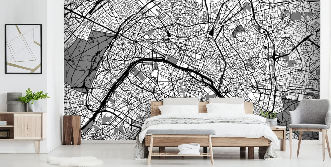 Para um papel de parede de mapa em preto e branco impressionante, você precisa instalar este mural detalhado do Mapa de Paris.