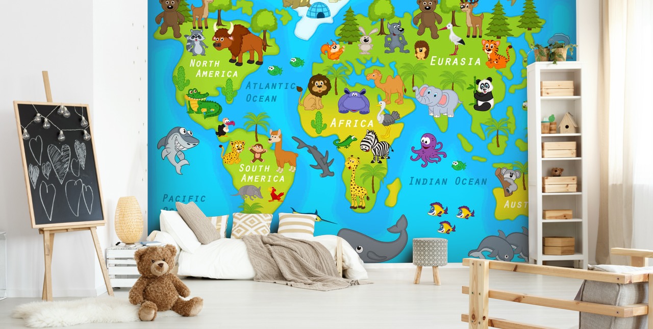 Transforme o quarto do seu filho com este papel de parede Map of the World with Animals feito à medida.