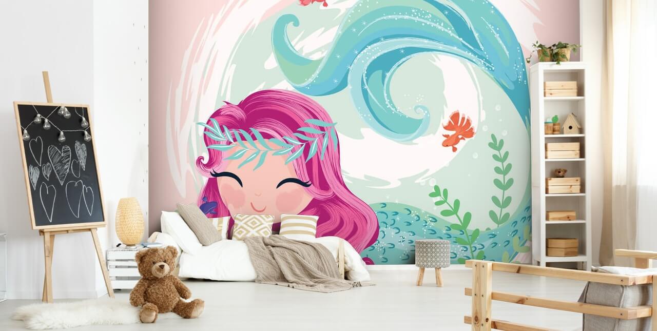 Decore a parede do quarto do seu filho com este papel de parede Mermaid Joy feito à medida.