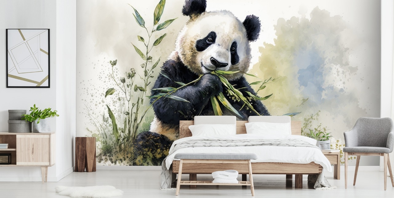 Desfrute deste lindo mural de papel de parede Panda Munching on Bamboo em qualquer cômodo da sua casa! É tão fofo!