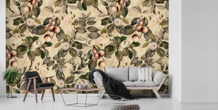 papel de parede de frutas e flores em tons neutros