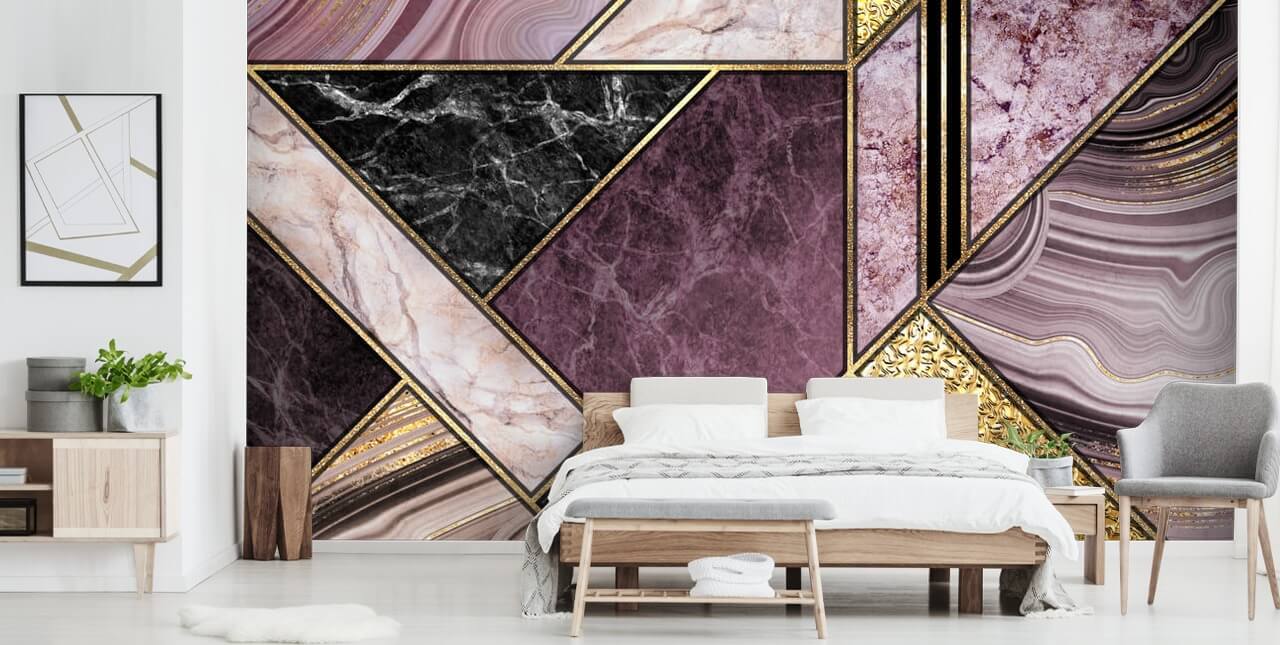 Para a máxima decadência e estilo, escolha este elegante e elegante papel de parede roxo e dourado. Adoramos as diferentes camadas de mármore lilás e lavanda e o luxo adicional da cor dourada - tão elegante!