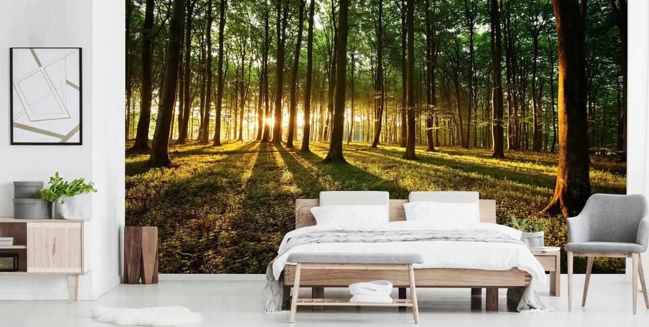 Adicione raios de sol à sua decoração com este deslumbrante mural de parede florestal. Capturando um lindo pôr do sol enquanto ele espreita por entre as árvores, este lindo mural certamente criará um ponto de discussão em qualquer ambiente.