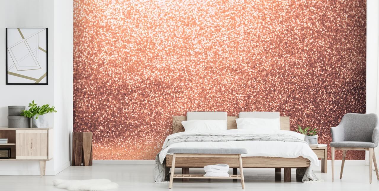 Tão na moda e lindo, este papel de parede glam glitter em ouro rosa transformará a sua casa para que seja digna de uma entrevista de revista!