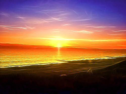 Pintura abstrata de um rio e um céu com nuvens rosa e laranja