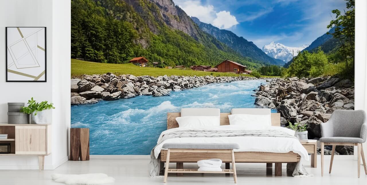 Decore a sua parede com este belo mural de papel de parede Swiss Landscape! Perfeito para a maioria dos espaços vivos, este papel de parede do rio da montanha dará vida a qualquer espaço!