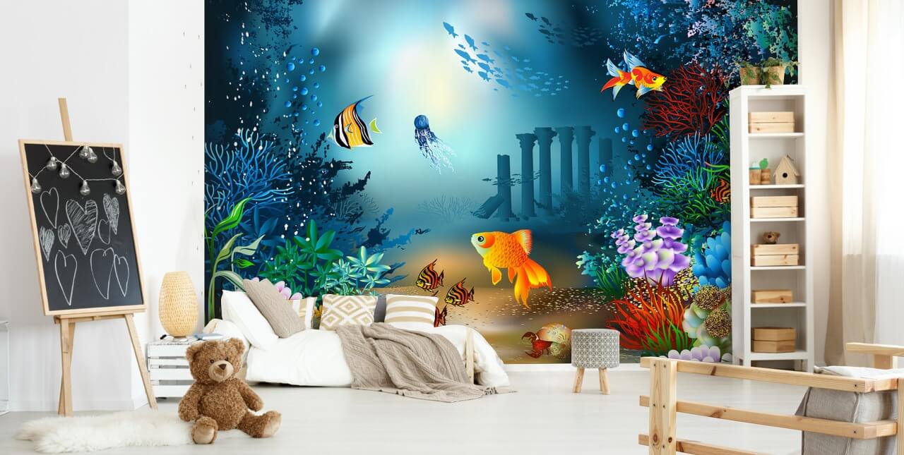 Descubra a cidade perdida de Atlantis com este lindo e intrincado papel de parede subaquático. Rodeado por muitas espécies diferentes de coral e sendo o lar de peixes como medusas e peixes-zebra, este mural de parede subaquático fará com que eles queiram explorar mundos subaquáticos.