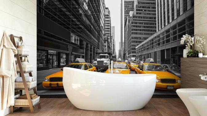 mural colorido de papel de parede com ilustração da cidade de Nova York chamado New York City Life, de Farida Zaman, para quartos e empresas