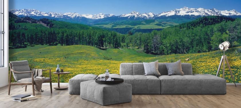 campo de prado amarelo com montanhas nevadas em papel de parede de distância