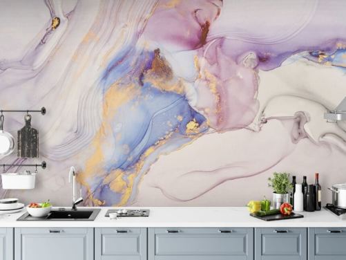 mural de papel de parede de mármore personalizável em azul claro e dourado chamado Dreamy Blue Watercolour para quartos, cozinhas ou banheiros