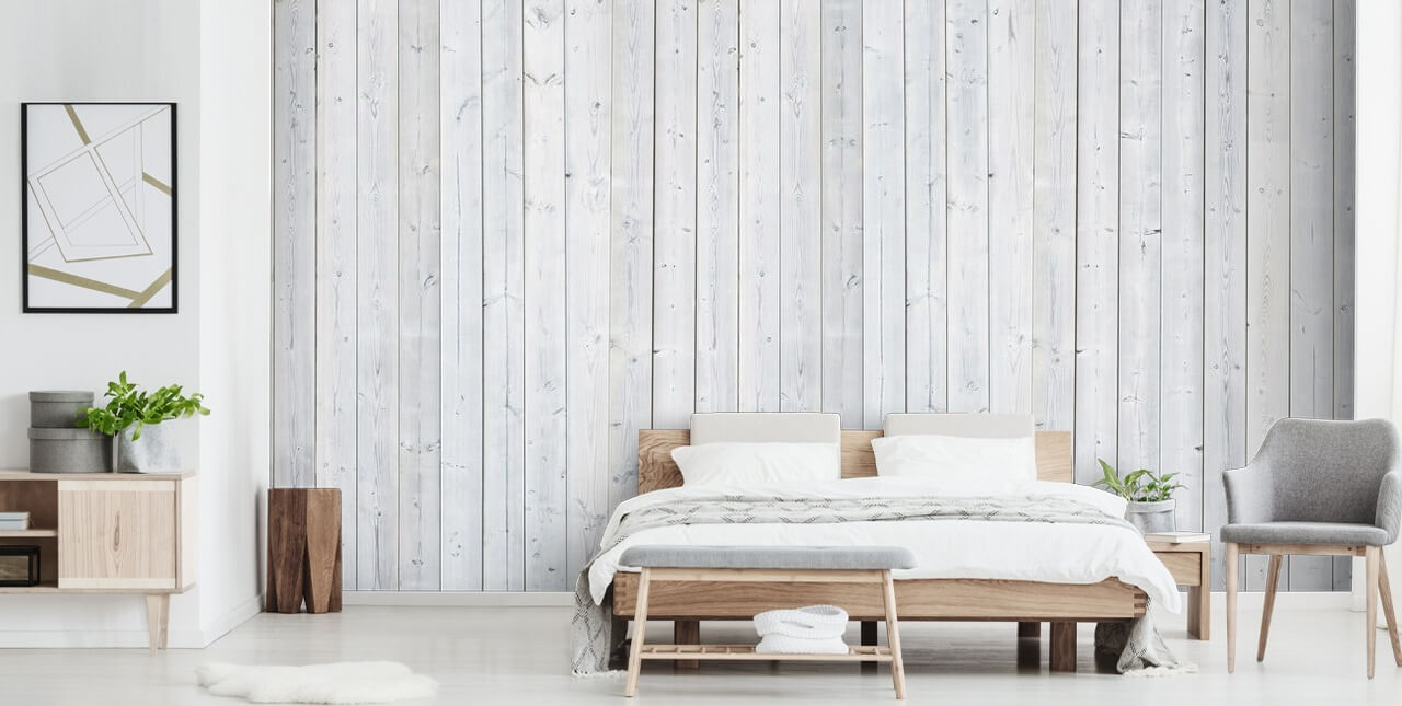 Dê uma reforma à sua casa com este deslumbrante papel de parede de madeira branca da Wallsauce.com. Com belos tons de branco e cinza, este papel de parede de painel é uma escolha minimalista.