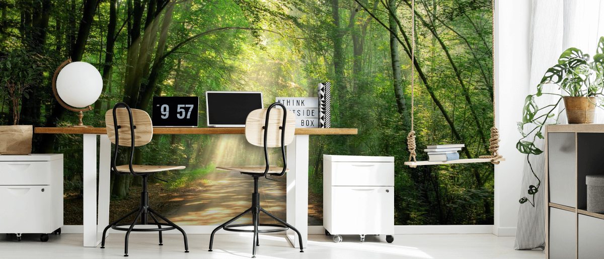 Traga serenidade para sua casa com este papel de parede Woodland Sunlit Track feito sob medida da Wallsauce.com.