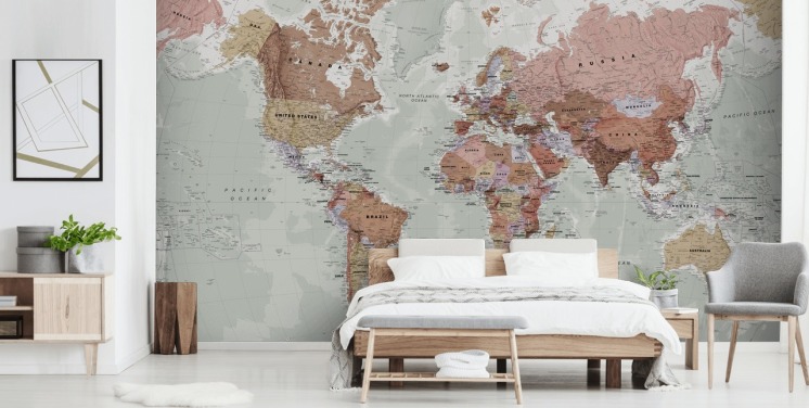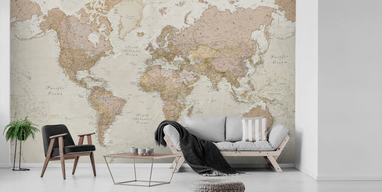mural de papel de parede neutro e personalizável do mapa-múndi chamado Classic World Map de Lovell Johns para quartos