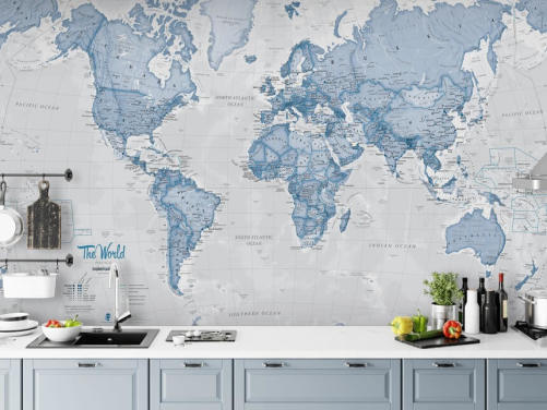 mural de papel de parede azul personalizado do mapa-múndi chamado World Political Blue de Lovell Johns para escritórios e quartos