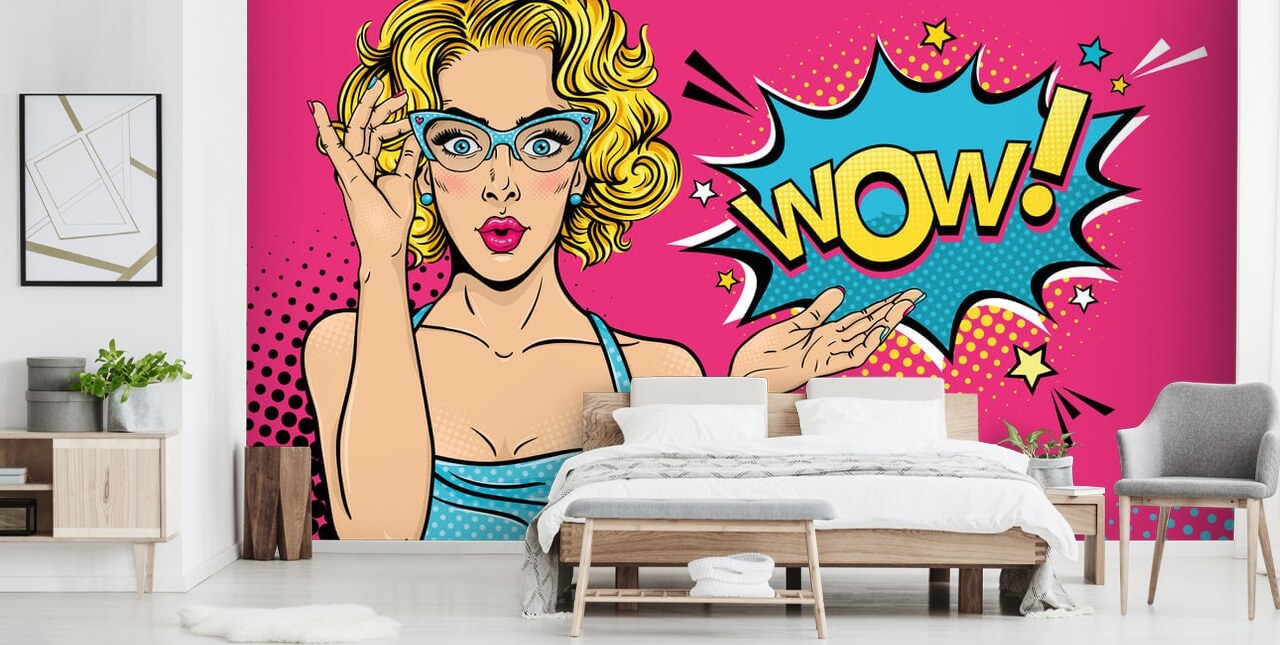Para uma parede de arte pop rosa quente e azul, você precisa escolher este legal papel de parede WOW da Wallsauce.com! Perfeito para um espaço de escritório moderno, uma casa colorida ou um bar artístico, este papel de parede pop art fará com que qualquer parede se destaque e faça você se sentir KAPOW!