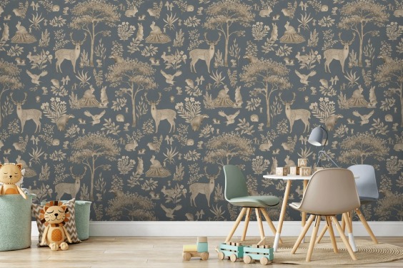 mural de papel de parede azul para crianças chamado Vintage Blue Fantastic Forest de Kikki Belle para um berçário ou quarto infantil