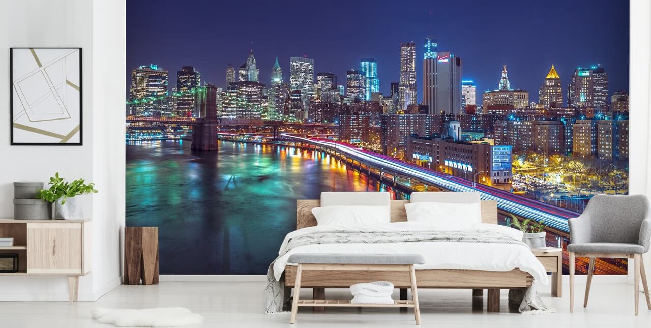 Fantastisk Bridght Lights Manhattan av East River väggmålning från Wallsauce. Denna högkvalitativa tapet är skräddarsydd efter dina dimensioner.