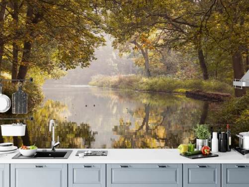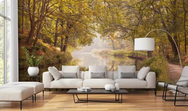 brun och grå kanal i vinterskog väggmålning av Assaf Frank för sovrum