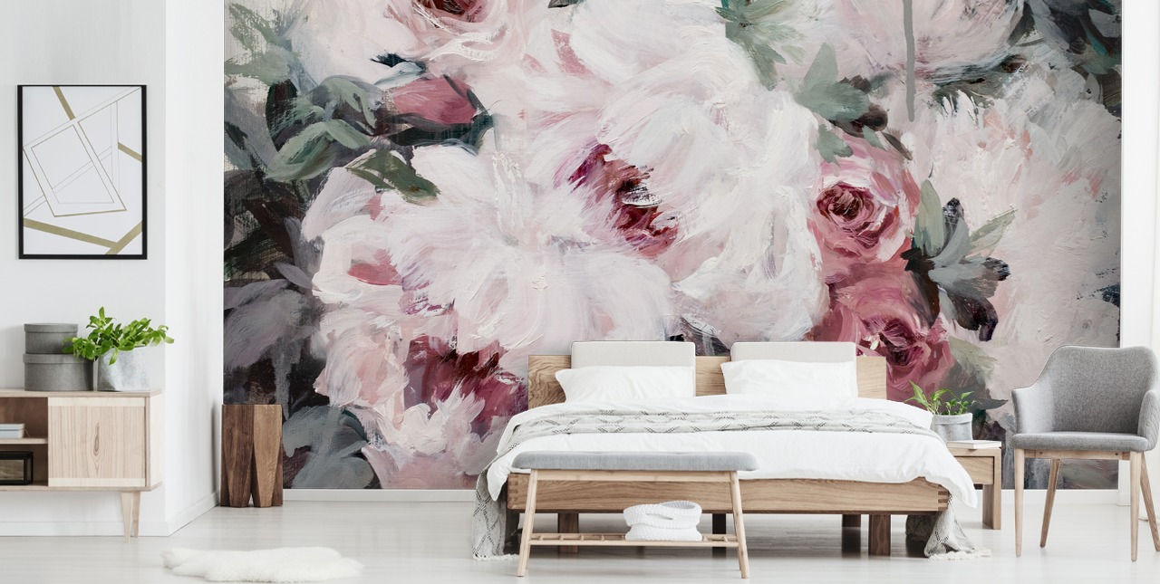 Denna vackra rosa Blush Bouquet väggmålning kommer säkert att ge ditt rum den funktionsvägg det förtjänar!