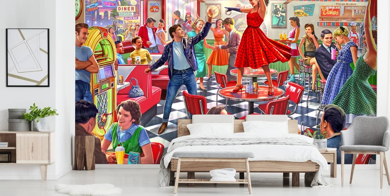 Rocka hela natten med denna skräddarsydda Dancing At The Diner tapetväggmålning designad av Steve Crisp. Full av ljusa färger, denna vintage stil tapet skulle se fantastisk ut i en cool 1950-talsrestaurang eller ett vårdhem för äldre!