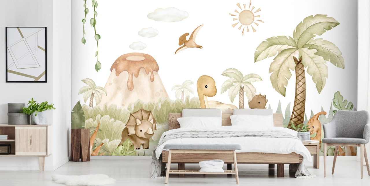 Den söta dino-väggmålningen har vänliga och bedårande dinosaurier, som bollar runt i ett lekfullt landskap som fångar essensen och magin i ett barns fantasi.