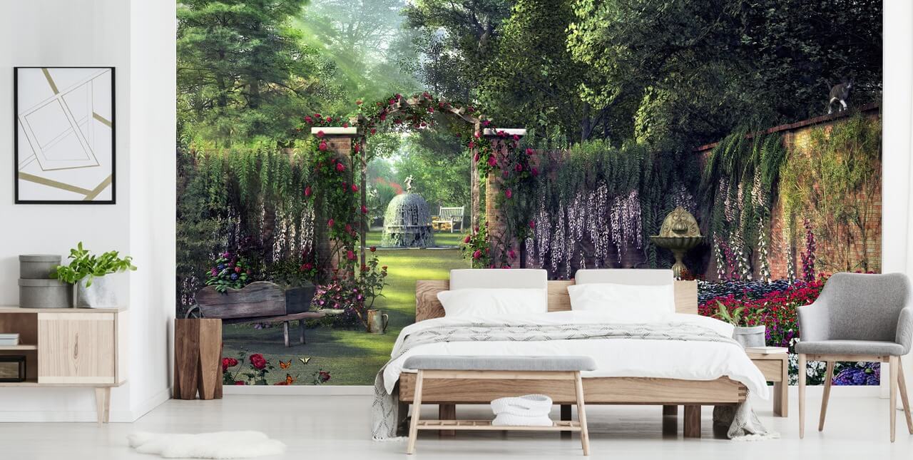 Har du någonsin drömt om att smyga in i en hemlig trädgård för att njuta av allt själv? Nu kan du med denna underbara blommig trädgård tapet väggmålning designad av den begåvade Dominic Davison. Rikligt med buskage foder trädgårdsväggarna och en blinkande fontän. Förutom en inbjudande bänk i fjärran att du inte kan vänta med att sitta på för att se vad du hittar genom dörröppningen. Denna vackra trädgård tapeter kommer utan tvekan att ge skönhet till något utrymme i ett hem eller vårdhem.